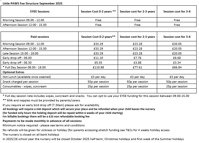 Following the most recent government guidance around nursery fees, we have revised our earlier session times and can confirm our initial fees. We will review our fees every 6 months in line with our booking policy.