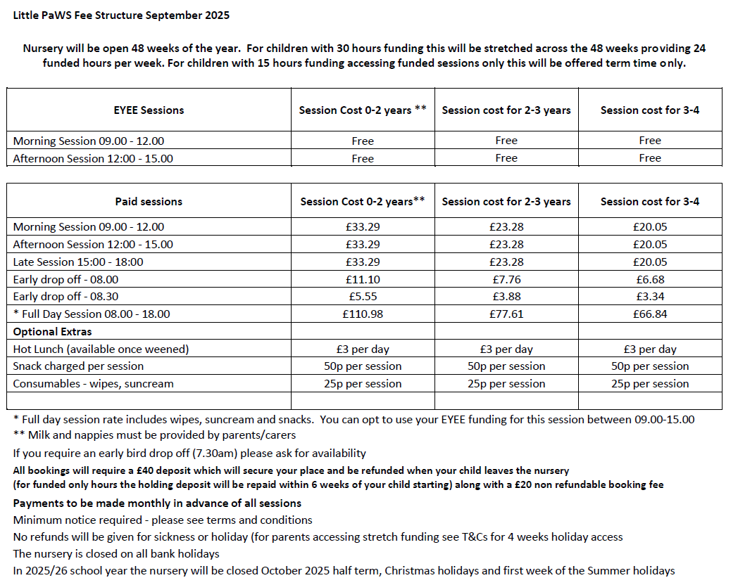 https://www.beststartinlife.gov.uk/We have worked with the local authority to develop our funding offer. Little PAWS Nursery will be open 48 weeks of the year. For children with 30 hours funding this will be stretched across the 48 weeks providing 24 funded hours per week. For children accessing 15 hours funding, sessions will be offered term time only.