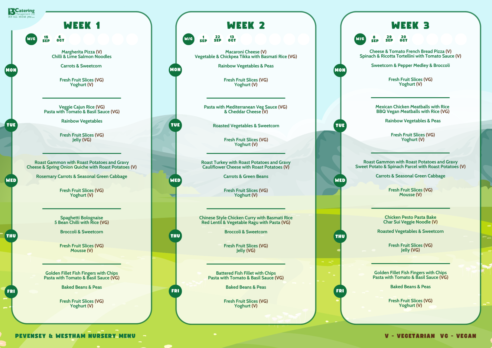 Nursery meals are served on site in nursery and are cooked fresh each day in the school kitchen. Please ensure you let the Nursery Manager know if your child has any dietary requirements.
